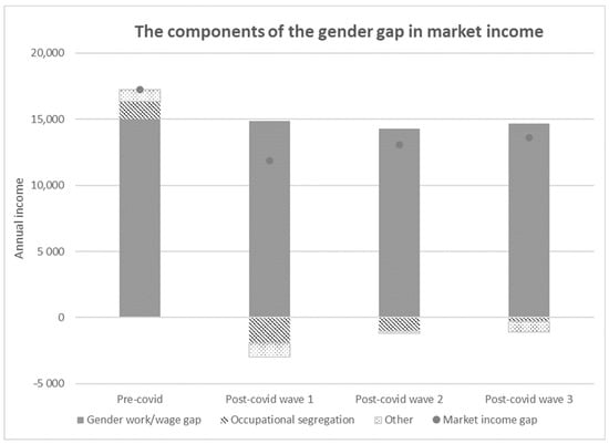 In the final stage of the analysis, we compared the distribution of male and female income and the drivers of the gender gap in income before and after accounting for the impact of the pandemic. Therefore, we incorporate a gender decomposition developed by () into our simulation. This allowed us to show how the pandemic-induced income and employment shock and the tax–benefit response alter gender income inequality in both market and disposable income.