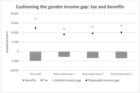 Quantifying the effect of the pandemic on the incomes of men and women is complicated by the fact that most representative surveys that contain information on family income, taxes, benefits and demographics are released with a delay of two or more years. In order to overcome this, we employed a nowcasting technique based on microsimulation () using the most recent data on employment and wage levels to calibrate a simulation model of household incomes, taxes and benefits. This approach produces a real-time picture of the population and the distribution of income from different sources and allows us to identify those most affected by the pandemic. We merged this framework with a gender decomposition technique developed by (). The authors develop a method to measure the cushioning effect of the tax–benefit system on gender income inequality and, using data and policies from 2017, estimate that the gender income gap is reduced tax–benefit policy by 10–40% in a cross-section of European countries.