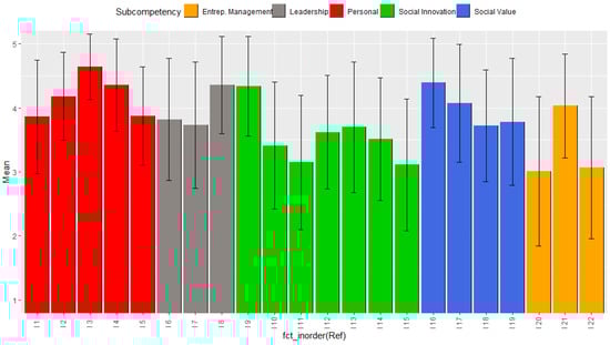 First, the results show those competencies that are best perceived by the sample (Table 3), with the subcompetency related to personal values standing out. Indicators such as communication, knowledge of others, motivation, perseverance, and persuasion are undoubtedly fundamental elements of the social entrepreneur profile (Shapovalov et al. 2019), although they are not sufficient at the time of entrepreneurship. It is important to note that the indicators with the best means (Motivation, Perseverance, Collaborative Work, Learning and Adaptability, and Code and Ethical Sense) are values that relate to what is known as entrepreneurship, i.e., characteristics that drive the person and motivate him/her to solve a problem innovatively (Gandhi and Raina 2018). However, these indicators can be considered generic since, by themselves, they do not contribute concrete tools to materialize ideas, as could indicators such as financing and administration, value generation, the management of limited resources, or the valuation of results and impact, which were indicators that, notably, had the lowest averages. Thus, as a first conclusion, the results allow us to appreciate that the sample of students as a group perceived themselves with great entrepreneurial intentions. However, they also perceived themselves as having limited practical, administrative, and implementational knowledge. Supporting this, Figure 2 allows us to corroborate that the personal, leadership, and social value subcompetencies were those that more than 50% of the sample developed above the satisfactory level (4.0), in contrast to those of social innovation and entrepreneurial management, which on average still reflected an opportunity for development (3.0).