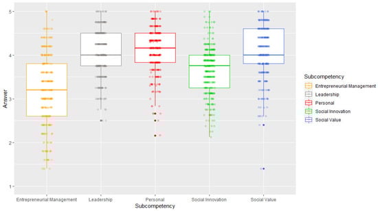 On the other hand, the BoxPlot in Figure 2 shows the distribution of the mean values of the 328 students by type of subcompetency. This analysis showed that the students developed the subcompetencies corresponding to leadership, personal, and social value to a greater extent. Approximately 50% of the students acquired a mean value of 4.0 out of 5.0 in each subcompetency. On the other hand, students had the lowest average values for the subcompetencies of entrepreneurial management and social innovation, where the average value fell between 3.0 and 3.5 on the measurement scale.