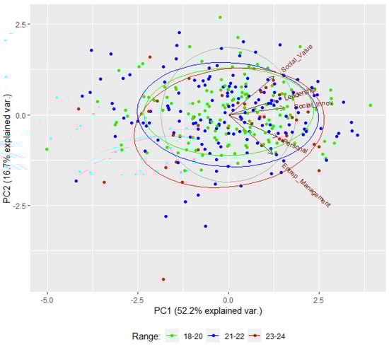 As a second aspect, Figure 3 (Principal Component BiPlot) allows us to delve more deeply into concrete situations perceived by the students about their development. The first thing to note is that the data reveal a contradictory result between the students’ perception of achievement and their ages. It would be expected that students who are more advanced in their formative process would perceive higher achievement, as they consider themselves more capable of starting a social enterprise. However, 9.35% of the 18 to 20-year-old group members perceived themselves as lacking, compared to 14.28% in the 21-to-24-year-old group and 11.5% in the 23-to-24-year-old group. These results may be due to two factors. The first may be related to the low averages in the professionalizing indicators (strategic development, financing, and management capacity), which argues why students who are close to graduation perceive themselves as less capable of facing the challenges of the environment beyond their desire and motivation for entrepreneurship. In the entrepreneurial process itself, entrepreneurship is promoted before implementation tools, which also seems to be reflected in the sample’s age and stage of development.
