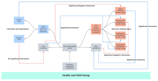 A diagrammatical representation of the interaction between basic psychological needs, decision-making and life goals of emerging adults in South Africa. All significant positive associations are indicated in the solid, blue arrow, while significant negative associations are indicated in a dash, red arrow.