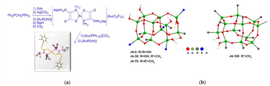 (a) Molecular structure (Ino-103) (taken from Laguna et al. 1998, Patent E-9802085); (b) Computational chemistry modeling of the ordered domains of a hybrid silicon xerogel (taken from Ospino et al. 2017).