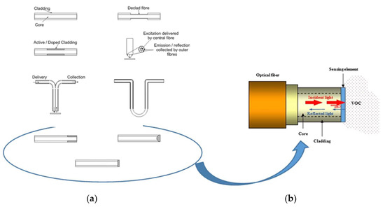 (a) Different geometries of optical fiber sensor elements; (b) diagram of an FOS with reflection geometry (elaborated from Estella et al. 2010).