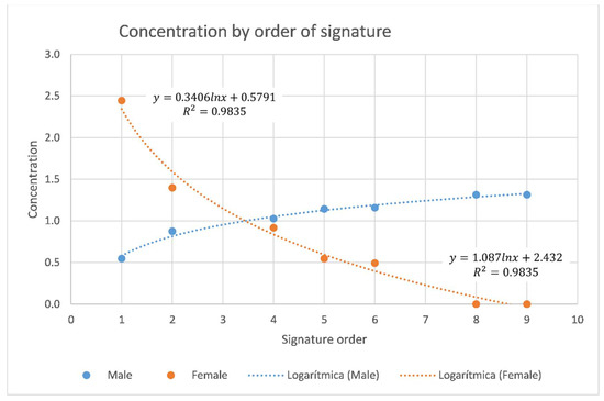 The ratio between each position in the byline order and the mean value for each gender provides a parameter (gender concentration of bylines in each position). This parameter is shown in Figure 7. This figure clearly indicates that the highest concentration of females is as first authors. The work carried out in the laboratory and the importance of the results describe the beginning of a trajectory in which women position themselves and contribute to scientific production.