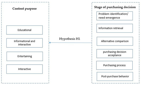 Hypothesis H1 was formulated: the existence of a statistically significant difference in consumers’ need for a particular content purpose (educational, informational, entertaining, and interactive) when the consumer is at a particular stage of purchasing decision (problem identification/need emergence, information retrieval, alternative comparison, purchasing decision acceptance, purchasing process, and post-purchase behavior) (see Figure 1).