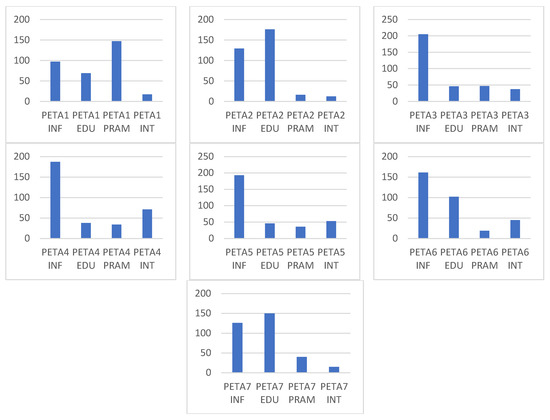 While analyzing received data, the need for informational content at all stages is clearly observed (see Figure 2). The least informational content is sought (compared to other stages) in the first stage when the consumer has not yet encountered a situation to be resolved. The need for educational content is clearly expressed in cases where the consumer is faced with a problem, the solution of which does not come from experience (PETA 2), or where it is necessary to learn how to use the products. In the first problem identification stage (PETA1), the consumer moves from a state where they do not understand that there is a problem to be solved by purchasing a particular product, to a state where the consumer understands the problem and takes action to address the problem.