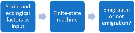The first research question concerns the application of agent-based modelling in particular. We can assume that the decision-making process of the individual can be modelled as a finite-state machine (Saini et al. 2011), that takes as an input the social and ecological factors perceived by the human, and then processes them to reach the behavioural output for that human (see Figure 4).