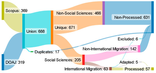 The inspection of the merged datasets showed that a significant portion of the retrieved documents related not to human migration, but rather to the migration of animals, biological organisms, and diseases, or to theoretical networks and computer science. There is no value for this literature review that derives from the inclusion of articles from branches of science other than social science; thus, all articles were subsequently labelled, manually, according to whether they belonged to social sciences or not. The labelling was conducted by us on based of the content of the title and the abstract of each article: we judge that no expert knowledge is required to conduct this task, besides an undergraduate degree in social sciences. The 671 references were therefore subdivided according to the following classes, as presented in Table 2.