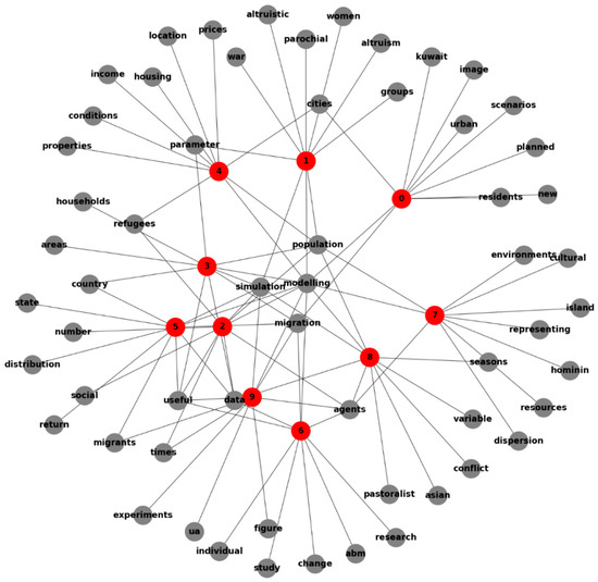 The choice as to what number of topics to extract via LDA is largely arbitrary, though it is customary to select 10 (Abirami et al. 2018). For this reason, we extracted the ten most important topics present in the corpus, and we represent below the graph that corresponds to them (Figure 6).