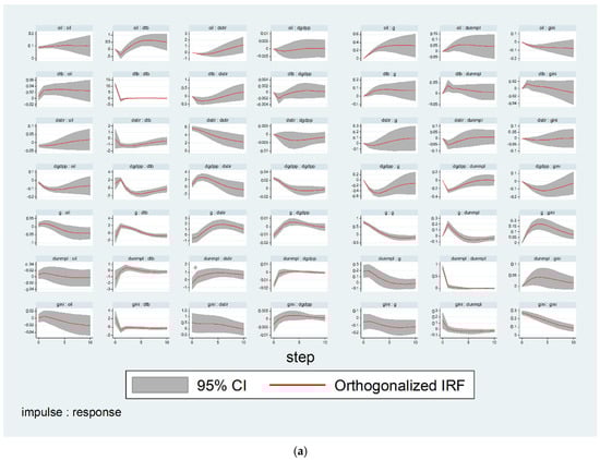 where is a (7 × 1) vector of endogenous variables for year and country , which include the Gini coefficient to measure income inequality (gini), unemployment rates (unmpl) to capture the earning heterogeneity, equity index (ind), capturing the income composition channel and house-price index (hpi) for the portfolio composition channel GDP per capita (gdpp) to measure economic growth, government spending (g), global variable (oil) and nominal rates (stir), is a (7 × 1) vector of a constant, is a (7 × 7) matrix of coefficient estimates, and is a (7 × 1) vector of system innovations, while is a cross-sectional identifier, and is the optimal lag length of each variable and is selected by observing the value of the Akaike-Information-Criterion (AIC) and Schwarz-Bayesian Criterion (SBC), since in a PVAR analysis choosing the optimal lag order is one of the first steps that need to be conducted, both in a moment condition and panel VAR specification. Therefore, PVAR analysis is dependent upon optimal lag selection. This model representation is adopted from Abrigo and Love (2016).