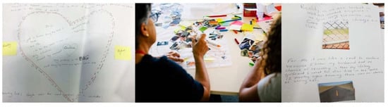 Design Activity 3: Myth vs. Reality—Exploring perceptions of caregiving. In the third activity, participants juxtaposed image maps of drawing on outcomes of Design Activity 1 alongside what they’ve perceived to be the myths (or broader societal misconceptions) about carrying significant caring responsibility. Figure 1 illustrates this activity: one participant drew a heart, to represent that all she had to offer was love, while another selected images of a road and bars to convey her journey (feeling ‘trapped’ in this caregiving role until the inevitable end—the death of both her husband and best friend from cancer).