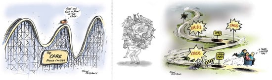 The images in Figure 3 illustrate carers experience of caregiving: being on a care rollercoaster, from lurching crisis to crisis, feeling like the weight of the world is on their shoulders. Carers explained that while others perceived them as “superhuman”, having “a special set of qualities” they were “just a human doing the best” to respond to what “life has thrown”—and they were “lurching from one crisis to the next”, “with no idea what I am doing, every day is different. You have no clue. You just have got to get on with it”. Maree—who is primary informal carer of both her mother and mother-in-law—vividly recalled the challenge of dealing with a crisis day: My mother had a fall under family member’s watch, had to lift her getting her off the floor, tend to bruising, consoling, reassuring, calling doctor, addressing mother’s anxiety, getting a call to say mother-in-law is throwing up and so going over to assist”.