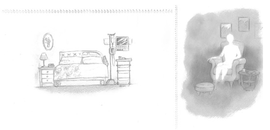 What carers found especially challenging was the transition—when home became a hospital. The bed was no longer a place of rest and refuge, but a site of medical intervention, as shown in Figure 7 below. The left-side sketch shows a normal bedroom on the left, and then the bed with hospital equipment on the other side, reflecting how daily life changes when caring for someone ill at home. The other sketch is of a memory; one carer explained how she could still sense her love husband in his beloved chair at home, and this sketch shows his ghostly form in his seat.