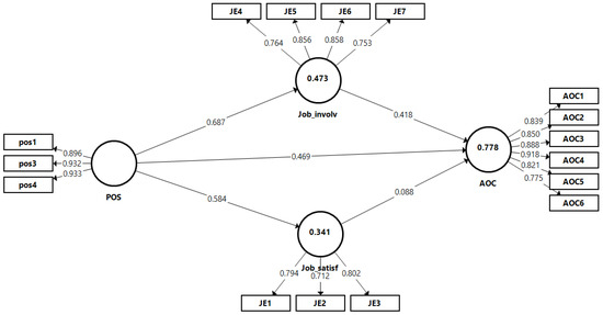 Fifth, following the approach of Hair et al. (2017), we conducted a collinearity test by determining the VIF values, finding that they range between 1.18 and 4.45, being below the threshold of 5, which reveals that there is no collinearity. To evaluate the quality of the model, we determined the coefficient of determination (R2) for the two endogenous variables of job satisfaction; job involvement and affective organizational commitment, which were 34.1%, 47.3%, and 77.8%, respectively, and higher than the 10% threshold recommended by Falk and Miller (1992). Regarding the Q2 values of job satisfaction, job involvement and affective organizational commitment (0.198, 0.303 and 0.552, respectively), the values obtained are greater than zero providing an additional indicator of model quality.