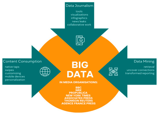 Taking into consideration the multiple uses of big data in media organizations and in order to have a better understanding of their dynamics in different application areas, all the information was included in a visualization. As shown in Figure 1, media organizations can take advantage of big data for content consumption and management, data journalism applications and practices, and data mining purposes.