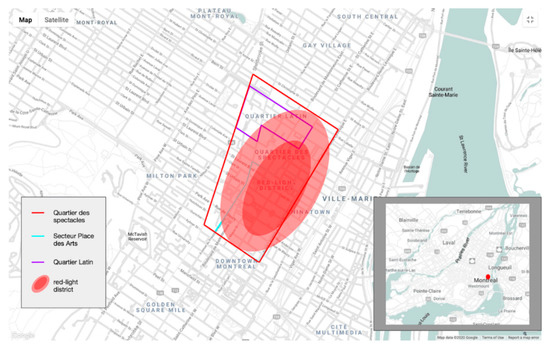 - Ville de Montréal. 2011. Qu’est-ce que le Quartier des Spectacles? Available online: http://archive.wikiwix.com/cache/?url=http%3A%2F%2Fville.Montreal.qc.ca%2Fportal%2Fpage%3F_pageid%3D5218%2C18973564%26_dad%3Dportal%26_schema%3DPORTAL (accessed on 10 April 2022).