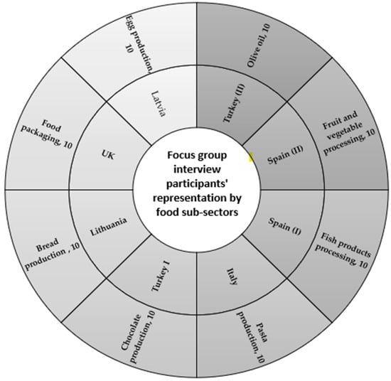 The focus group interviews involved stakeholders of eight food sub-sectors who were either employers/employers or worked in food industry related education institutions as trainers, teachers, academicians, and researchers (80 persons in total) in Spain, the United Kingdom, Italy, Latvia, Lithuania and Turkey (Figure 3 and Figure 4). The selection of the countries to be further analyzed in this study was according to two aspects. Firstly, the authors conducted a preliminary survey of countries that were full members or collaborating partners of the Association for European Life Science Universities (ICA) (n.d.) relating to the circular bioeconomy, the sustainable use of natural resources and the protection of the environment. The availability of appropriate data, motivation to cooperate with research team and wish to collaborate within a zero-waste food production chain were important aspects for achievement of the current study goals. Therefore, the mission of ICA—to enhance its partner institution’s success in education, research and innovation for a sustainable bioeconomy and society, by engaging with European institutions and networks, to share experience—was considered as consistent with the authors’ study settings. Accordingly, important criteria in selecting the countries were their experience and knowledge to promote effective and inclusive decisions for ESG implementation issues in food sector enterprises and identify how food sector companies can enhance their practical on-the-job training in waste management, which could empower them to enhance sustainability commitments. Secondly, eight specific sub-sectors were chosen after consultations with ICA member organizations so that the chosen sectors do not overlap with each other and provide a distinctive expertise. Accordingly, the authors sent out invitations to the life sciences universities and major food sector associations of the countries to participate in this study and, after receiving a positive response, jointly with potential partners evaluated which food sub-sectors are the most traditional in these countries with growing ESG investing attractiveness and future development potential, of which finally eight sub-sectors were identified (Figure 4).