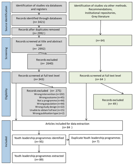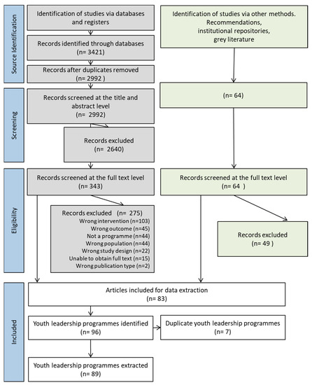 The electronic database search identified 2992 records for screening. The title and abstract screening resulted in 343 articles which proceeded to full-text screening, and 68 studies were included in the review. A further 64 programs were identified through additional searches (repositories, recommendations, etc.), these were screened at the full-text level, and 15 programs were identified for inclusion in the final review. Of the studies identified in the search, seven contained programs duplicated in other studies (Bulanda et al. 2013; Forbes-Genade and van Niekerk 2017; Redivo and Buckman 2004; Shelton 2009; Ty 2011; Zimmerman et al. 2018), and five reported on more than one youth leadership program (Aldana et al. 2016; Berlin et al. 2007; Dowds et al. 2017; Larson et al. 2005; Owen and Irion-Groth 2020; Ty 2011), resulting in 89 youth leadership programsreported on in the full review. The full list of included programs is available in Supplementary Materials Table S2 (pp. 2–43).