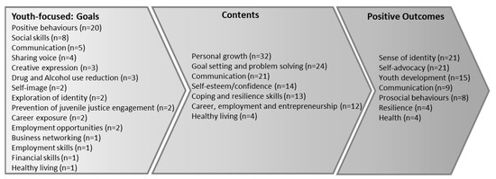 Positive outcomes were broadly reported as youth development in fifteen programs, in addition to improvements in the sense of identity (n = 21), self-advocacy (n = 20), communication (n = 9), resilience (n = 4) (Berlin et al. 2007; Larson et al. 2005; Shimshon-Santo 2018; Sisselman-Borgia 2021), health (n = 4), and pro-social behaviors (n = 8). The youth-focused goals, contents and positive outcomes are presented in Figure 2 below.