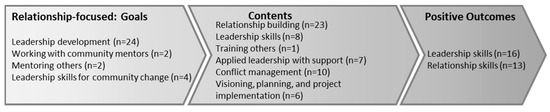 Positive outcomes were reported from the programs in the areas of leadership skills (n = 16) and relationship skills (n = 13). The relationship-focused goals, contents and positive outcomes are presented in Figure 3 below.