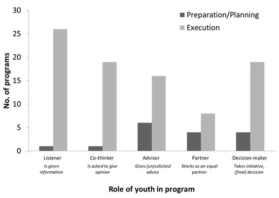The involvement of youth stakeholders in the execution phase of the studies was less active as listeners in 26 programs or as co-thinkers in 19 programs. More active involvement was identified with participants as advisors in 16 programs, partners in 8 programs and decision-makers in 19 programs.