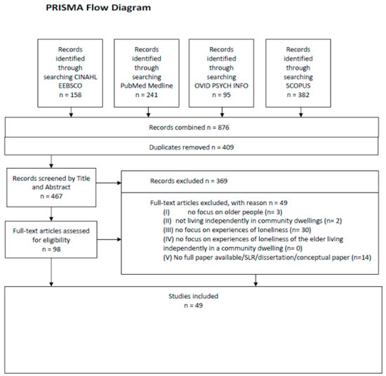 A total of 876 citations were identified through the databases searched. Once duplicates were excluded (n = 409), the remaining publications titles and abstracts (n = 467) were screened by two researchers (GDP and GB) individually and then agreeing on the findings, to exclude 369 studies based on the selection criteria. The remaining 98 were further screened by reading the full texts by the same two researchers (GDP, GB). In cases of any differences in evaluations, a third researcher (AF) independently evaluated these studies, and a consensus was reached among the researchers. At the end of the selection process, 49 publications were included (see Figure 1).