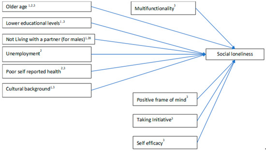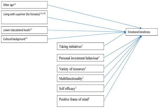 - Fierloos, Irene N., Siok Swan Tan, Greg Williams, Tamara Alhambra-Borrás, Elin Koppelaar, Lovorka Bilajac, Arpana Verma, Athina Markaki, Francesco Mattace-Raso, Vanja Vasiljev, and et al. 2021. Socio-demographic characteristics associated with emotional and social loneliness among older adults. BMC Geriatrics 21: 114. [Google Scholar] [CrossRef]