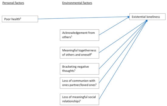 The antecedents to existential loneliness were measured by only two studies, as evident in Figure 4 (Sjöberg et al. 2019; Hemberg et al. 2019). Poor health was found to predict existential loneliness in one of these (Hemberg et al. 2019) and existential loneliness was found to be eased by being acknowledged by others, experiencing meaningful togetherness with others and themselves, bracketing negative thoughts, connecting to partners, or loved ones and, continuing social relationships (Sjöberg et al. 2019; Hemberg et al. 2019).