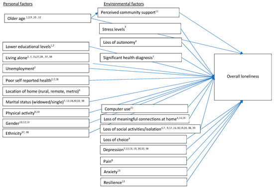 Most articles studied overall loneliness in participants. In these studies, most authors used either a general question, open ended interview questions, or the UCLA (and its cultural adaptation measures) 3-item measure of loneliness across the globe, and across rural, remote, regional, and metropolitan locations. Resulting in the factors listed in Figure 5 being presented.