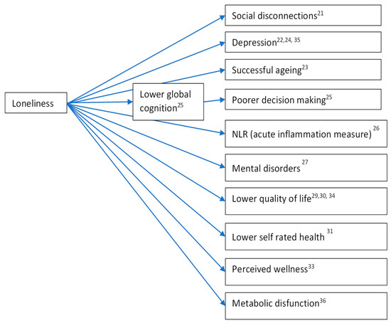 As evident in Figure 6, loneliness was found to result in higher levels of social disconnection (Talmage et al. 2021), depression (Gonyea et al. 2018; McHugh Power et al. 2020; Warner et al. 2019) mental disorders (Gyasi et al. 2019), lower quality of life (Schorr and Khalaila 2018; Tan et al. 2020; Ward et al. 2019) lower self-rated health scores (McHugh and Lawlor 2016), perceived wellness (Hodgkin et al. 2018), as well as, metabolic disfunction (Shiovitz-Ezra and Parag 2019) and acute inflammation (Koyama et al. 2021). Whereas the relationship between loneliness and decision making was mediated by lower global cognition (Stewart et al. 2020). The presence of poor self-rated health, mental disorders, and depression outcomes in research exploring both the antecedents and consequences of loneliness suggest these relationships are complex but interconnected.