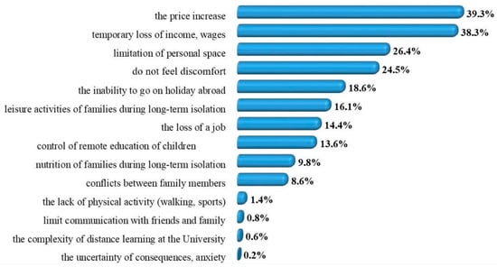 One of the priority measures to control the spread of coronavirus infection is the restriction of social contact of the population and the regime of self-isolation. To a greater extent, self-isolation discomfort among respondents is associated with a decrease in quality of life (rising prices, falling incomes, loss of work), limited personal space and freedom of movement as well as the need to organize leisure and food for the family during a long and closed stay at home (Figure 1).