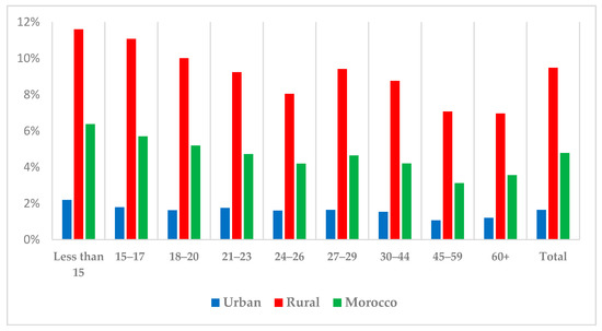 In addition, the illiteracy rate remains high among women (about 38% of Moroccan women were illiterate in 2015), especially in rural areas. It should be noted, however, that this rate is much lower among women aged 15–24 and was 6.5% in 2015 (HCP 2021). Access to the world of work remains complex for women. At the end of 2014, the rate of unemployed women was 10.5% (HCP 2015). Similarly, 19.1% of women aged 15 to 24 were unemployed in 2014, while young Moroccan women represent 47% of higher education.