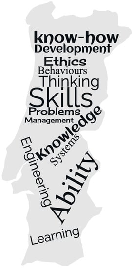 Using a summative content analysis, the analysis of word frequency in the documents submitted for accreditation indicates that “skills”, “ability” (N = 23), and “knowledge” (N = 22) are the most mentioned terms. Other words, such as “management” (N = 20), “engineering” (N = 17), “systems” (N = 15), “development” (N = 14), and “problems” (N = 13), were also stressed. The words correspond to 13.4% of the total words studied. Figure 1 represent graphically the analysis of word frequency on LOs mentioned in Portuguese electrical or computer engineering curricula of new study cycles submitted for accreditation.