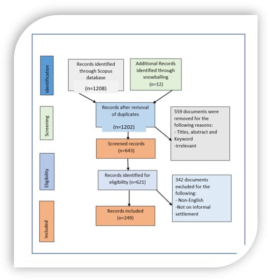 The following syntax was used to launch the query: “flood OR flooding AND *human AND settlement* OR *informal AND settlements* OR vulnerable OR marginalised AND interventions OR resilience OR mitigation OR adaptation AND (LIMIT-TO (OA, “all”)) AND (LIMIT-TO (DOCTYPE, “ar”)) AND (LIMIT-TO (SUBJAREA, “SOCI”) OR LIMIT-TO (SUBJAREA, “ENVI”) OR LIMIT-TO (SUBJAREA, “ENGI”) OR LIMIT-TO (SUBJAREA, “ARTS”)) AND (LIMIT-TO (LANGUAGE, “English”))”. Selected articles from Scopus had the aforementioned terms in the title, keywords, abstract, or all three. The time period for publication was left unrestricted. At first, 1220 articles were found. We next narrowed down our choices using precise inclusion and exclusion criteria so that only publications that conformed to the study subject would be included in our analysis.