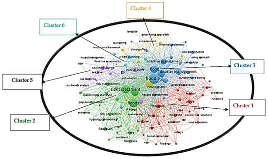 The major keywords in Cluster 1 may be grouped under the research theme “disaster reduction, planning, and resilience in informal settlements” and Cluster 2 under the theme “disaster modeling and risk analysis”. Cluster 3 may be grouped under the theme “vulnerability, participation mapping, and policy approach”, Cluster 4 under the theme “global changes in sea level and climate”, Cluster 5 under the theme “flood damage due to climate and sea level change”, and Cluster 6 under the theme “sustainable integrated methods for climate change mitigation”.