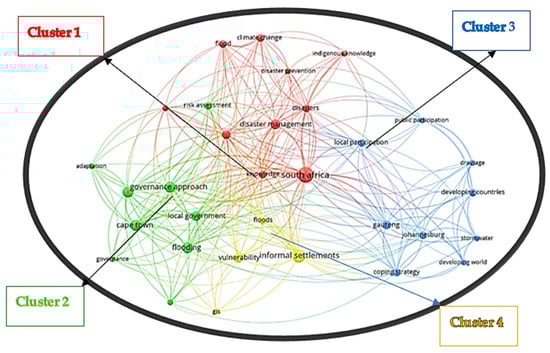 To locate significant thematic clusters, we employed co-occurrence analysis. Each cluster is made up of several frequently recurring terms. Figure 5 displays the results of the analysis with a minimum threshold of five keywords. In terms of both frequency of occurrence and overall link strength, the following terms stand out: disaster management, knowledge, risk assessment, vulnerability, governance approach, local government, governance, drainage, indigenous knowledge, local participation, adaption, and coping strategy. Higher occurrence and link strength values for the term “informal settlements” are unsurprising since it was a part of the search term and the evaluation is centered on papers that looked at its connection to flooding-related incidents. Four main thematic clusters can be seen in Figure 5 and are shown in Table 2.