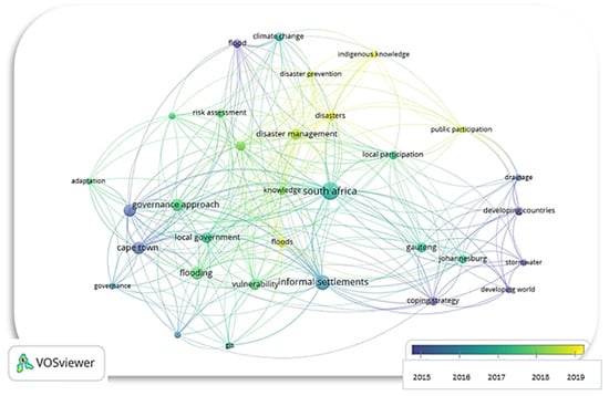 Cluster 4 (yellow): The term “vulnerability” describes a society, system, or entity’s traits and conditions that make it vulnerable to the negative impacts of a disaster (). “Limpopo, North-West, and Eastern Cape” are South Africa’s three most vulnerable provinces. However, this doesn’t exclude other South African regions from vulnerability and susceptibility to floods (). There are few studies on South Africa’s informal communities’ susceptibility to climate-change-related flooding, and those that do tend to concentrate locally in rural areas (; ). Flood disasters are occurring more frequently, and informal settlements have the most physical vulnerability to floods due to factors including obstructed drainage, poorly constructed homes, insufficient accessibility, washed-away unplowed roads, and weak sewage and storm-water infrastructure (). It is imperative to comprehend how vulnerable human communities are to flooding. The temporal keyword co-occurrence analysis identified areas of recent research interest in the topic of discussion as shown in Figure 6.