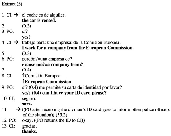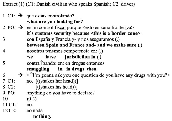 In the first of these two exceptions, two young Danish civilians were stopped. Before the beginning of the conversation transcribed in extract (1) (see Figure 3), one of these two civilians had mentioned that she is from Denmark, but she speaks Spanish well as she lives in Spain.