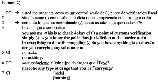 The next extract (2) (see Figure 4) is the second police check in which the reason for stopping the car is provided. This encounter involves two Spanish civilians who inform the PO that they are from a town near to La Jonquera–Le Perthus.