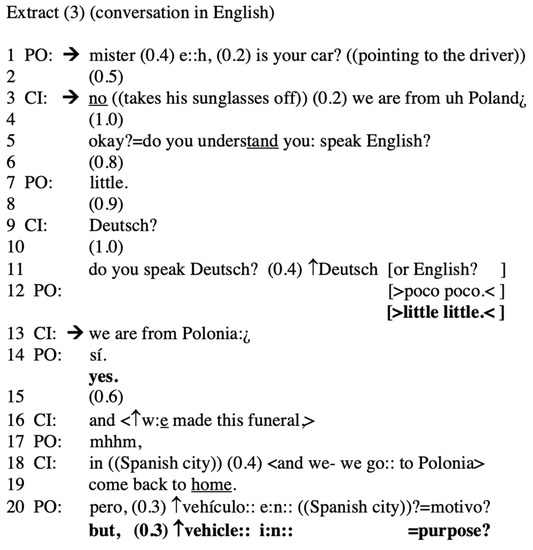In line 3, the CI is providing information that has not been requested by the PO, avoiding a quick follow-up question about the ownership of the car. Then, in line 5, the CI introduces a sequence that serves to establish common ground (the language the participants speak), allowing the civilians more time to avoid answering the PO’s question. The CI’s interactional strategy is evident, for as the PO already asked the question in English (line 1), there was no need to negotiate English as the language of this conversation. With this action, the CI takes the initiative in the interaction, and as in the case of extract (1), it is the civilian who has a better command of the language used and who becomes the one who asks questions to the police. In this regard, extracts (1) and (3) establish a link between language proficiency and assuming the role of questioner in the conversation.