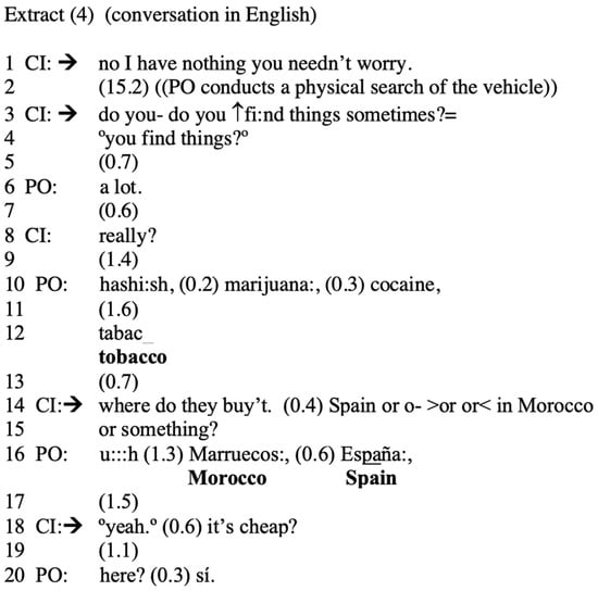 Before the beginning of this extract (4), the CI explained he is from England, and he had been in Spain on holiday. After that, the PO started to inspect the vehicle. Since this interaction is in English, this means that the CI is in a superior speaking position in this conversation, since he is a native English speaker, while the PO is not fluent in that language, allowing the CI to even state that the PO does not need to be concerned about him, “no I have nothing you needn’t worry” (line 1). The CI is attempting to influence the PO’s assessment of the vehicle inspection by seeking a quick resolution of suspicion, rather than staying quiet and waiting for the PO to decide whether to further expand the encounter or let him go.