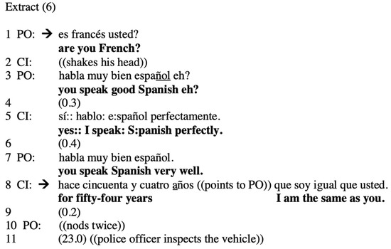 Extract (6) begins after 57 seconds of the conversation. While a police officer inspects the interior of the vehicle, another police officer (PO), who until then has participated very little, decides to begin an interaction with the CI. After asking the CI where he was travelling from and for his place of residence (France), in line 1 the PO asks about the CI’s citizenship, “es francés usted?” (are you French?). This can be considered an example of crimmigration in practice, asking about immigration issues during a crime check, a trend in the securitisation of EU internal borders since the abolishment of border control (see van der Woude and van Berlo 2015). After that, despite the CI’s response with a negative gesture (shakes his head) (line 2), the PO does not cease in his attempts to make the CI engage in the conversation, praising the CI both in line 3 “habla muy bien español eh?” (you speak good Spanish eh?) and line 7 “habla muy bien español” (you speak Spanish very well). In CA terms, this is known as a verbal “gift”, a positive politeness strategy designed to contribute to the generation of a topic (Svennevig 1999). In practice, the PO is moving the interaction towards solving the problem arising from how the CI lives in France, but speaks perfect Spanish. In line 8, as a measure to resolve the problem, the CI communicates a message of belonging to the PO, “soy igual que usted” (I am the same as you). With this message, the CI informs the PO that he is a Spanish citizen despite living in France, which has consequences for the interaction. Specifically, it leaves the PO speechless and reacting only with head movements (nods twice) (line 10). In addition, there is a long, 23 seconds silence in the conversation as the vehicle inspection is in progress (line 11). Therefore, the CI manages to avoid further questions from the PO related to immigration status (or any type of question), redirecting the attention of the encounter to crime control (vehicle inspection).