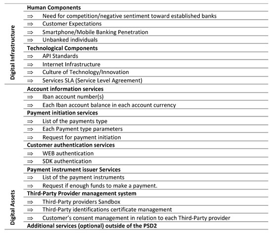 The business aspect of these financial institutions related to the sharing economy is open banking. O’Leary et al. (2021) determined the elements of business processes necessary for assessing the readiness of financial institutions for open banking implementation. Based on these ideas, the authors developed the actual elements, allowing for the assessment of the readiness of financial institutions for open banking operations (see Figure 2).