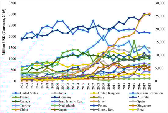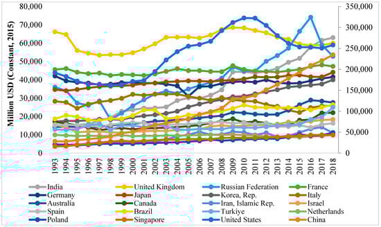 The present study is based on time series annual data from 1993 to 2018 for the top twenty military spending countries—the United States, China, India, the United Kingdom, Russia, France, Germany, Japan, Korea, Italy, Australia, Canada, Iran, Israel, Spain, Brazil, Turkiye, the Netherlands, Poland and Singapore.