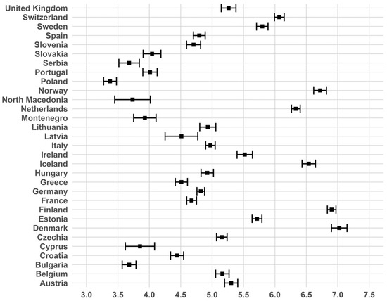 Mean of the standard generalized trust question. Source: European Social Survey wave 9 and 10 (2018–2020), respondents aged 18–85. Bars indicate the 95% confidence intervals of the means.