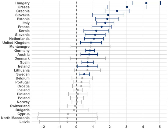 Figure 4 shows the average marginal effect of generalized trust on allowing at least a few migrants from poorer countries outside Europe to come and live in the given country. Out of the 31 nations, generalized trust had a statistically significant (p < 0.05) and positive effect in around half (16) of the nations. In these 16 countries, the effect of generalized trust differs considerably. At the upper end, in Hungary, a 1 scale point increase in generalized trust is related to a +4.2% probability of allowing migrants to come to the country, while in Sweden at the lower end, the positive effect is much weaker, +0.48%. Greece (+3.04% per scale point) and Czechia (+2.45% per scale point) had similarly strong effects on Hungary, while five other countries (the United Kingdom, Germany, Austria, Ireland and Spain) had an AME weaker than +1%, just as Sweden.