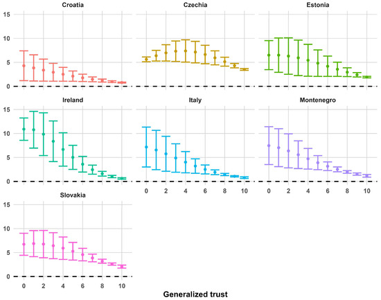 Figure 6 presents this diminishing effect of generalized trust. For example, in Italy, a 1 scale point increase in trust from the lowest possible trust value (0) has an AME of +7.17%, while higher trust levels and further increases (for example, from 9 to the maximum of 10) have an AME of only +1.07%, a much weaker effect. Similarly, in Montenegro, moving upwards from a zero trust yields a substantial positive effect (+7.47%), while at higher levels (at a 9 generalized trust, for example, only an AME of +1.53%), this is not the case.
