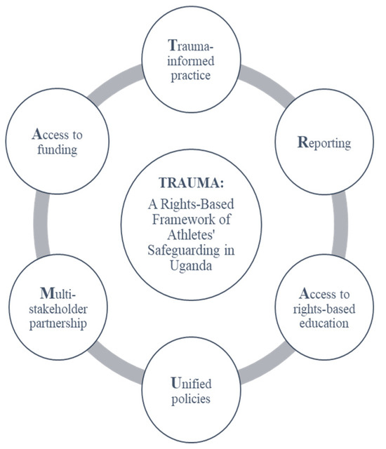We propose six recommendations of practice, which together comprise a rights-based, multi-contextual framework of athletes’ safeguarding, with the acronym ‘TRAUMA’, that is relevant to the local culture of Uganda, and of other sub-Saharan countries with similar cultural norms (Figure 1):