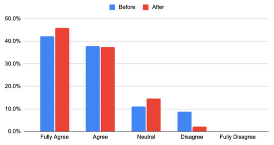 To answer how teenagers’ inclusion impacted the views of council members on the issue of climate/environment, items 3–18, 3.2, and 5.2 were used. From items 3.2 and 5.2, we gain insight into whether council members realized the impact their discussion with teenagers had on their opinions. The question of whether seeing teenagers urge action to be taken about climate change makes you eager to address those issues showed that 95.8% of council members agreed/fully agreed, and 4.2% were neutral as shown in Figure 2. This result indicates that the positive impact the teenagers had on council members is directly correlated with the likelihood of the latter agreeing to their inclusion. Similarly, item 5.2, which related to whether the teenagers’ opinions presented in the meeting influenced the council members’ opinions, shows that 62.5% agreed or fully agreed, while 33.3% were neutral and 4.2% were negative. This shows that, unlike the majority agreement that teenagers influenced their likelihood of acting, they did not necessarily influence their political policies/decisions. Items 3–18 collected the overall opinions of council members before and after the meeting on climate issues.